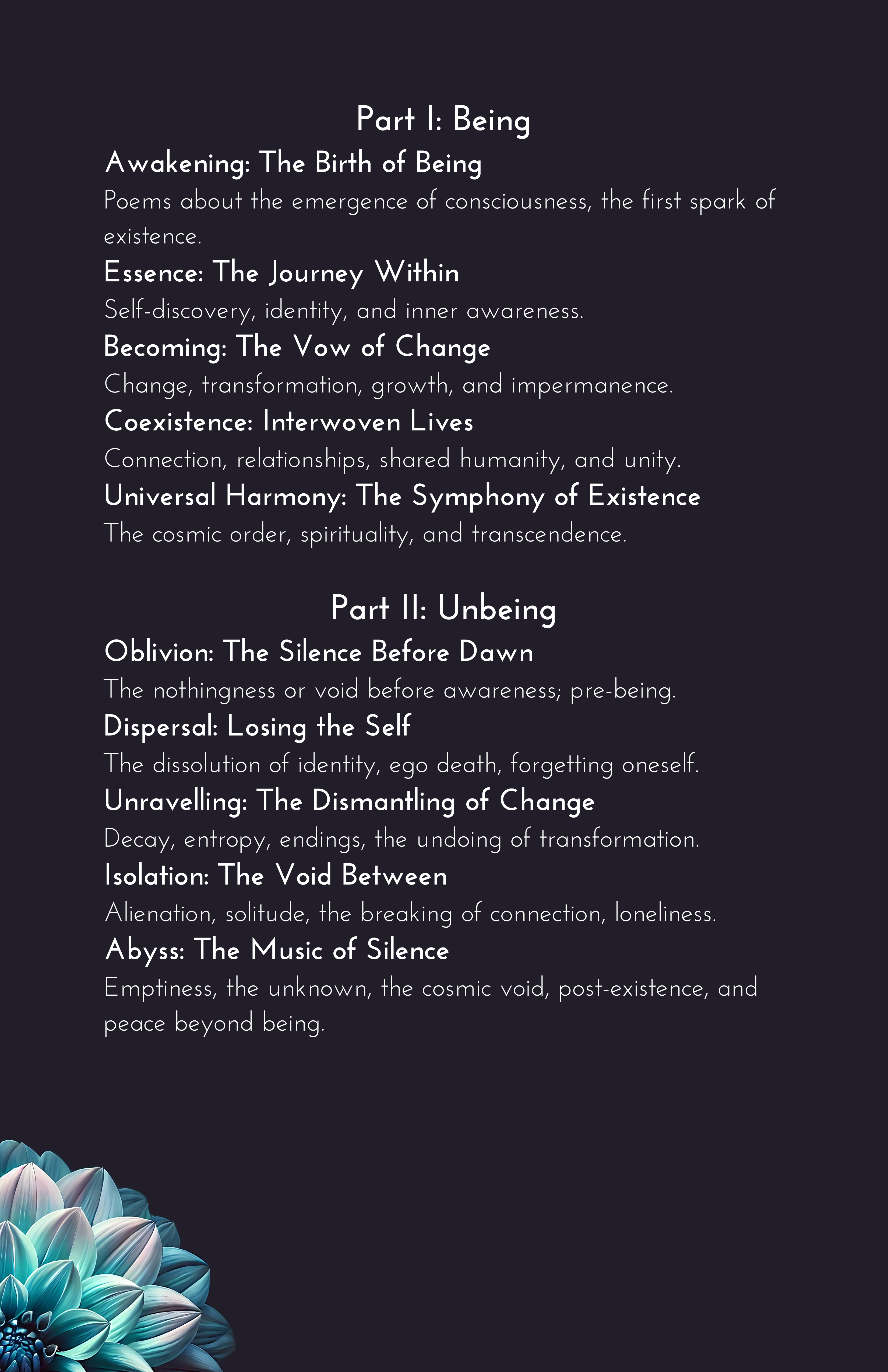 Part II, Unbeing, turns inward to the void, ego dissolution, impermanence, isolation, and transcendence beyond being. It meditates on the silence, emptiness, and cosmic stillness that follow the ebbing of existence, offering readers a contemplative space to explore impermanence and the eternal cycle of life and dissolution.